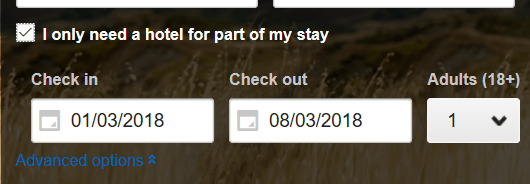 So what happens when I search for Flights/Hotel on Ebookers? I will select ‘I only need a hotel for part of my stay’. Please note search is for one person.